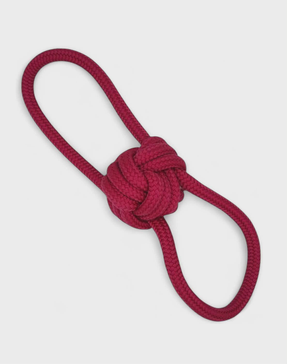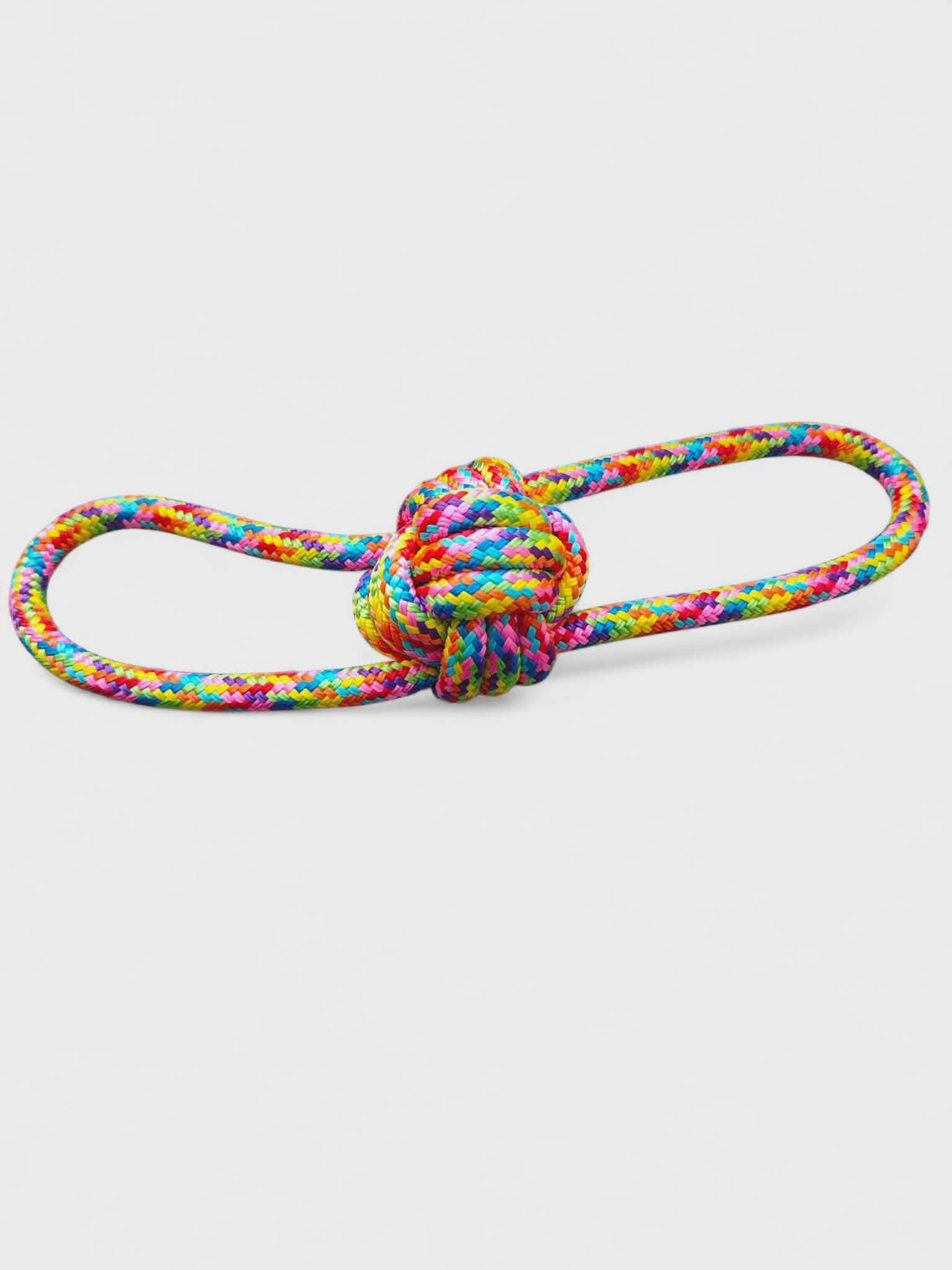 Jouet de traction à double poignée en corde PPM ultra résistante, fait main et personnalisable en taille et en couleur.