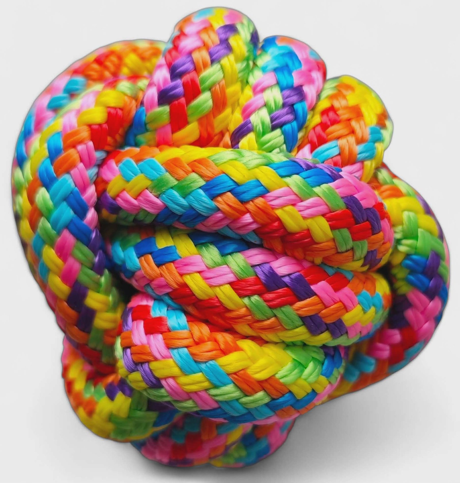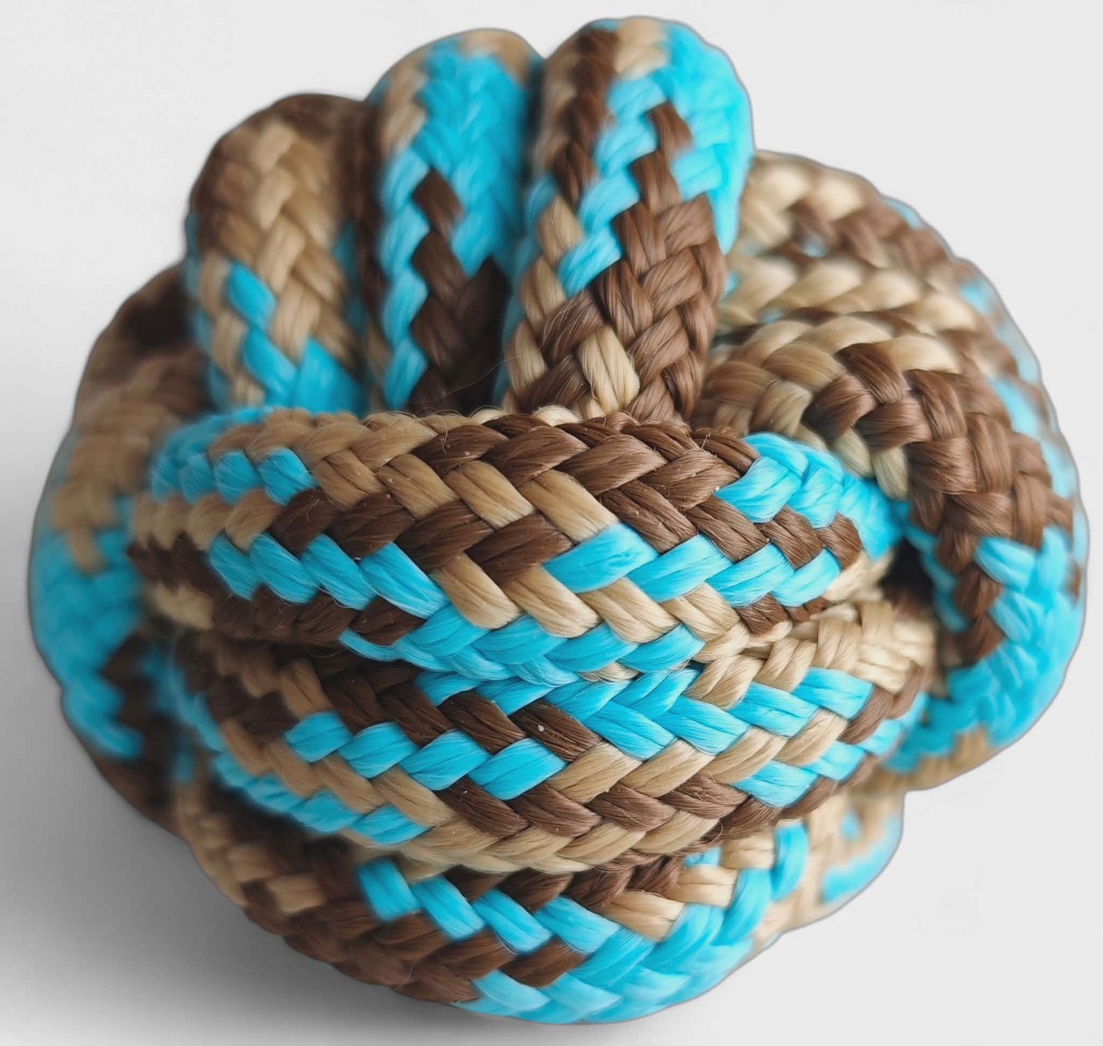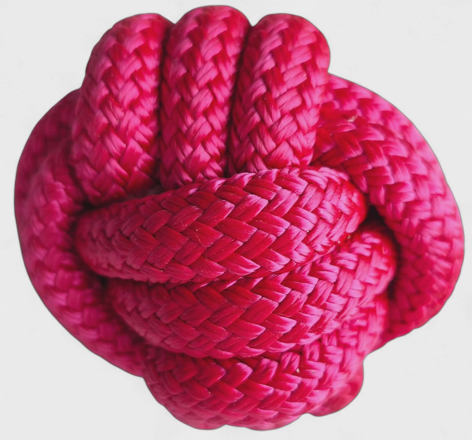 Balle en corde nouée ultra résistante, faite main et personnalisable en taille et en couleur. Jouet idéal pour les chiens puissants.